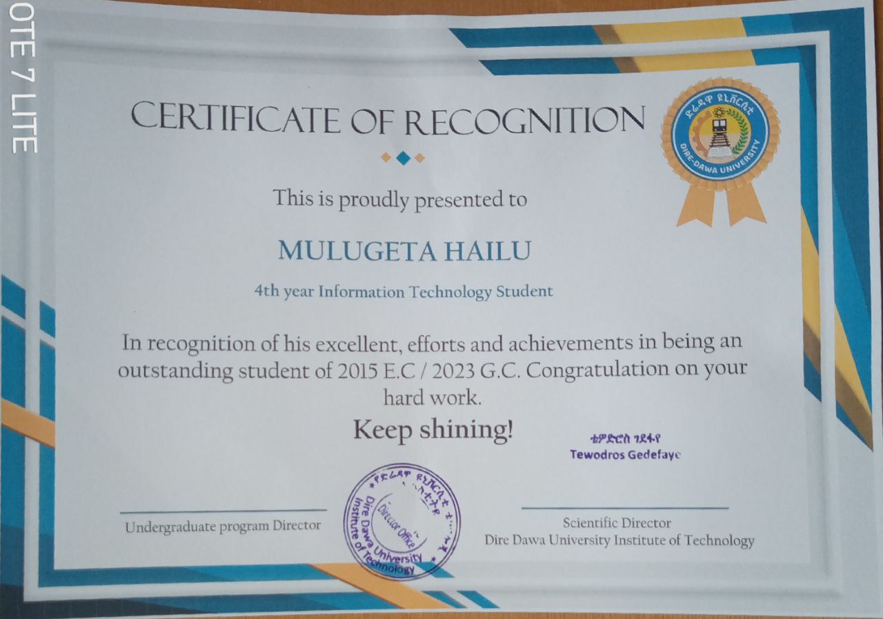 dedicated professional with a degree in Information Technology from Dire Dawa University, obtained in 2016 E.C. With a strong educational background, Mulugeta gained valuable hands-on experience through a 3-month internship program at Awash Bank. During this time, Mulugeta demonstrated the ability to work effectively in a professional setting, gaining practical skills and knowledge in the field. Mulugeta is eager to further develop and apply these skills in a challenging and rewarding IT role.
